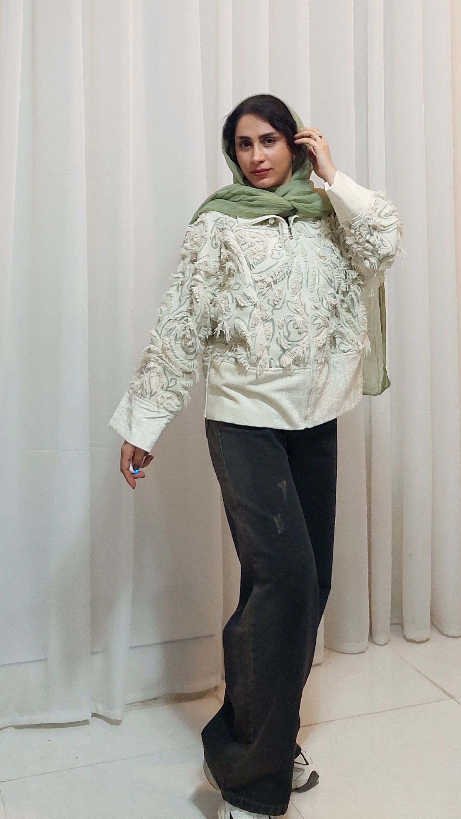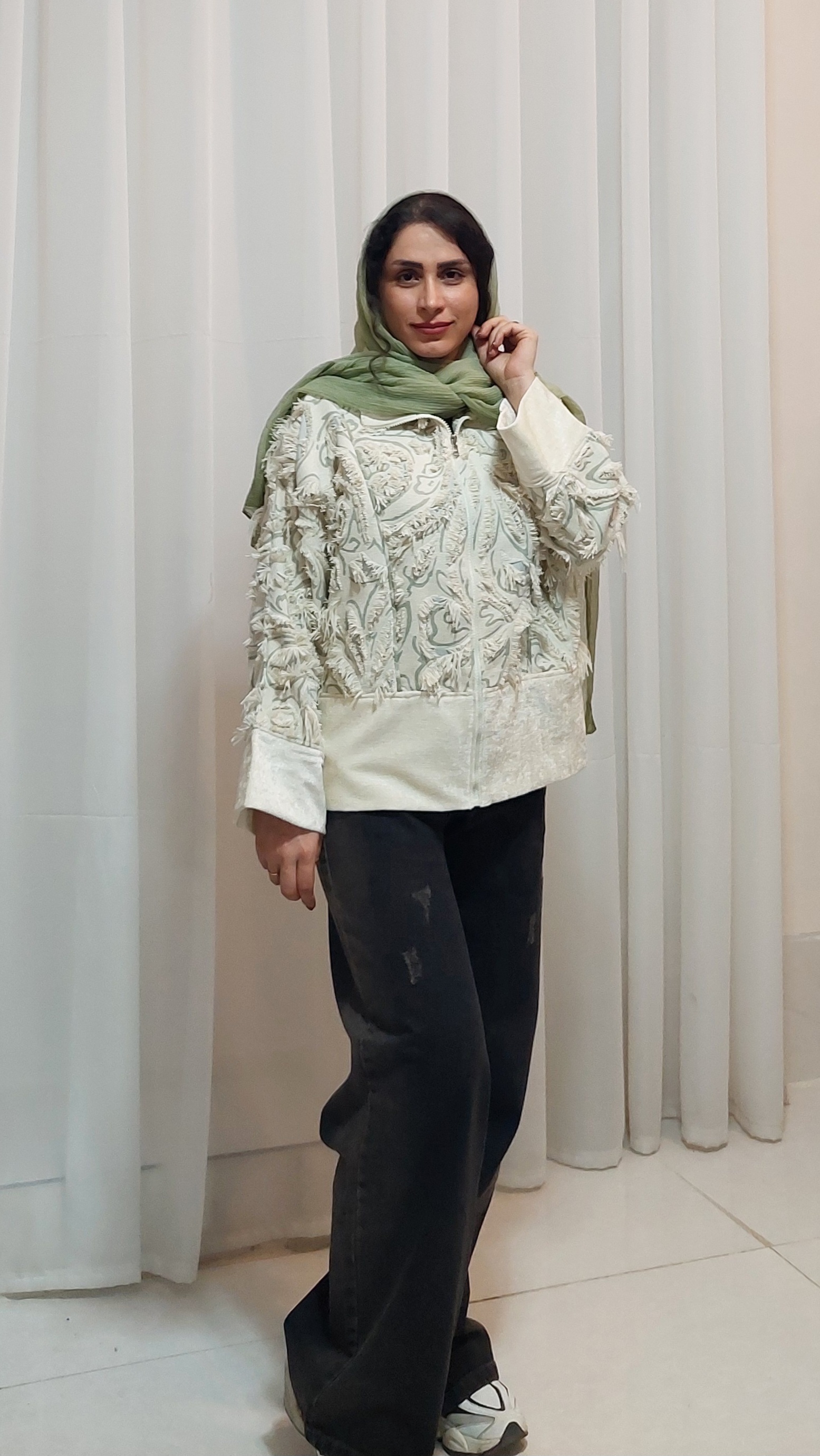 بامبر خوشکل مخمل ژاکارد طرح ریش ریش با قد ۶۵ و آستین کیمونو گشادی. گشادی پایین ۱۲۴ و گشادی آستین ۳۸.