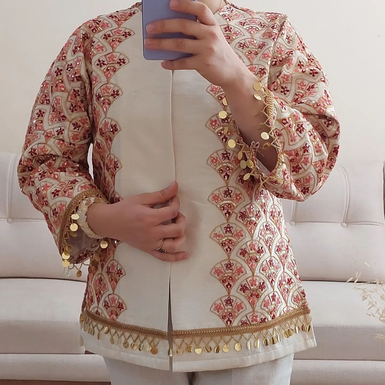 New collection1403 کت طلا جنس تافته سوزندوزی قد۷۰ فری سایز ارسال ز کاری به اطلاعات بیشتر